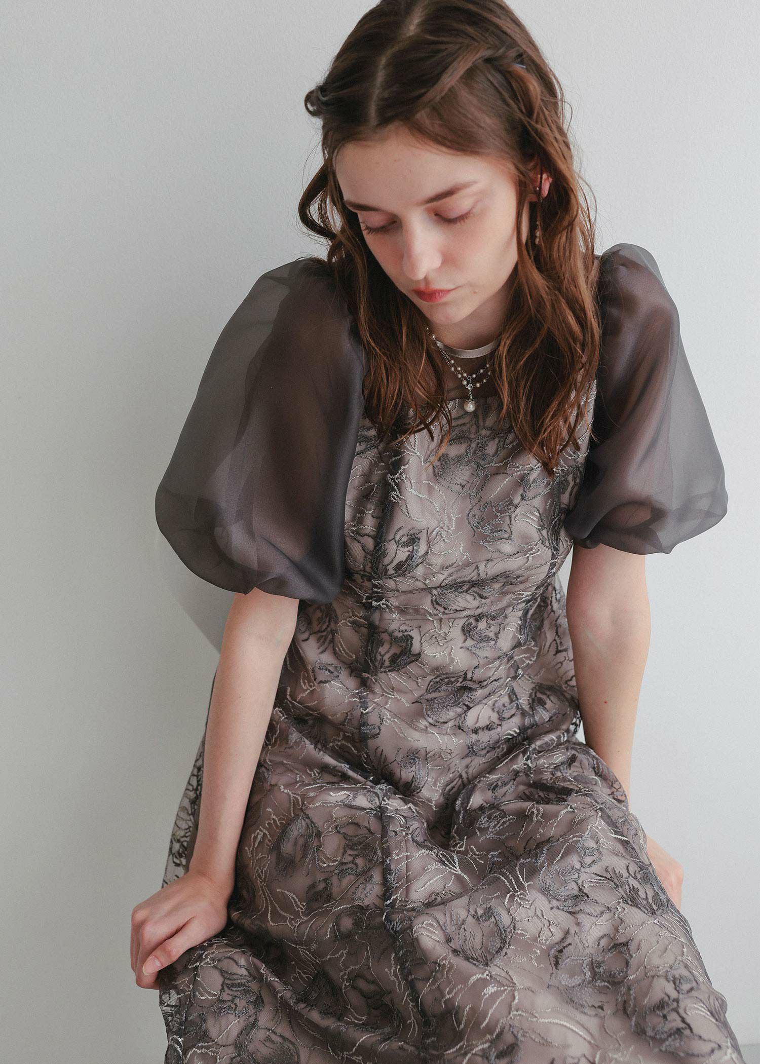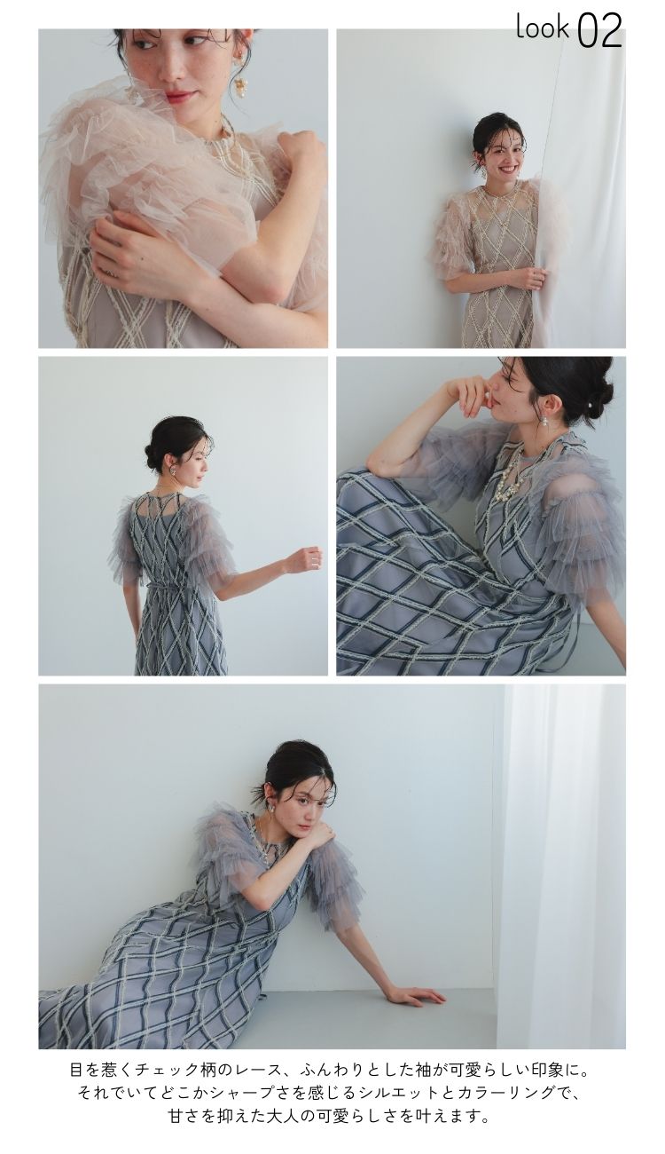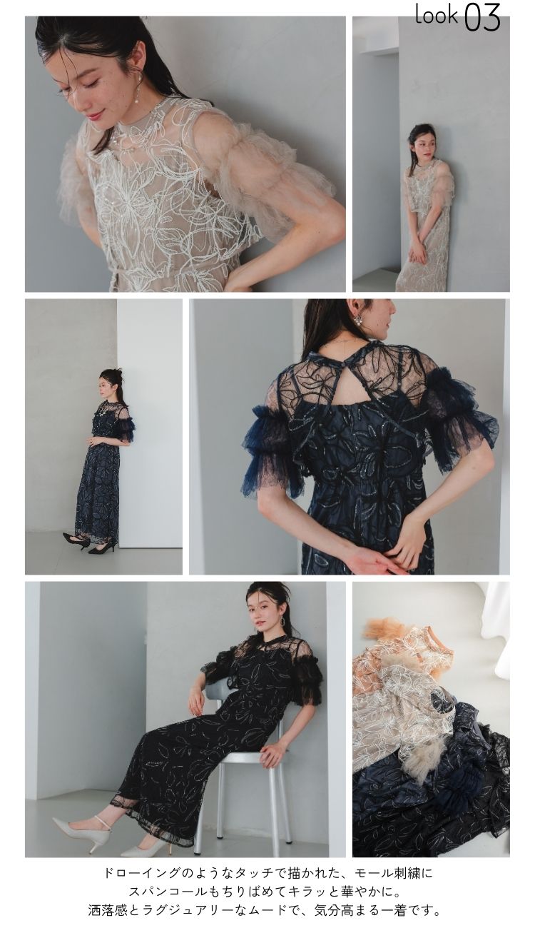 ニュアンスカラーで刺繍された花柄が目を惹く華やかなドレス。ヨーク部分と袖は無地のシアー素材で切り替える事で、顔回りが引き締まった印象に。