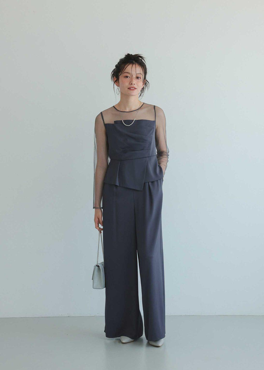 トレンド感のあるフリルブラウスと、シンプルなワンピースのセットドレス。チュール素材のフリルブラウスは、クセがなく着やすいデザインなのに、しっかりと華やかさを演出してくれるアイテム。
